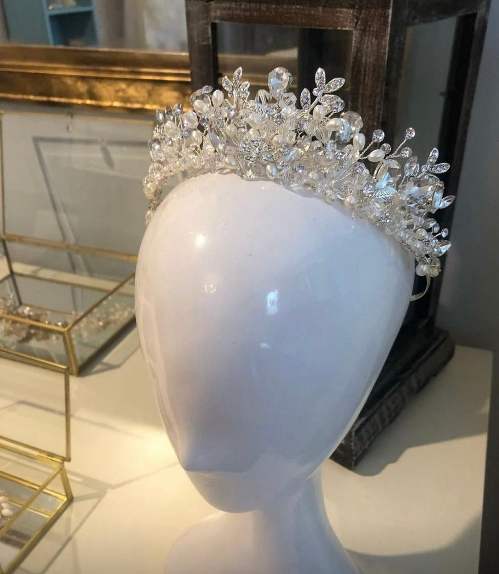 Corona con ramas de cristales detalles de perlas y mini broches de pedrería
