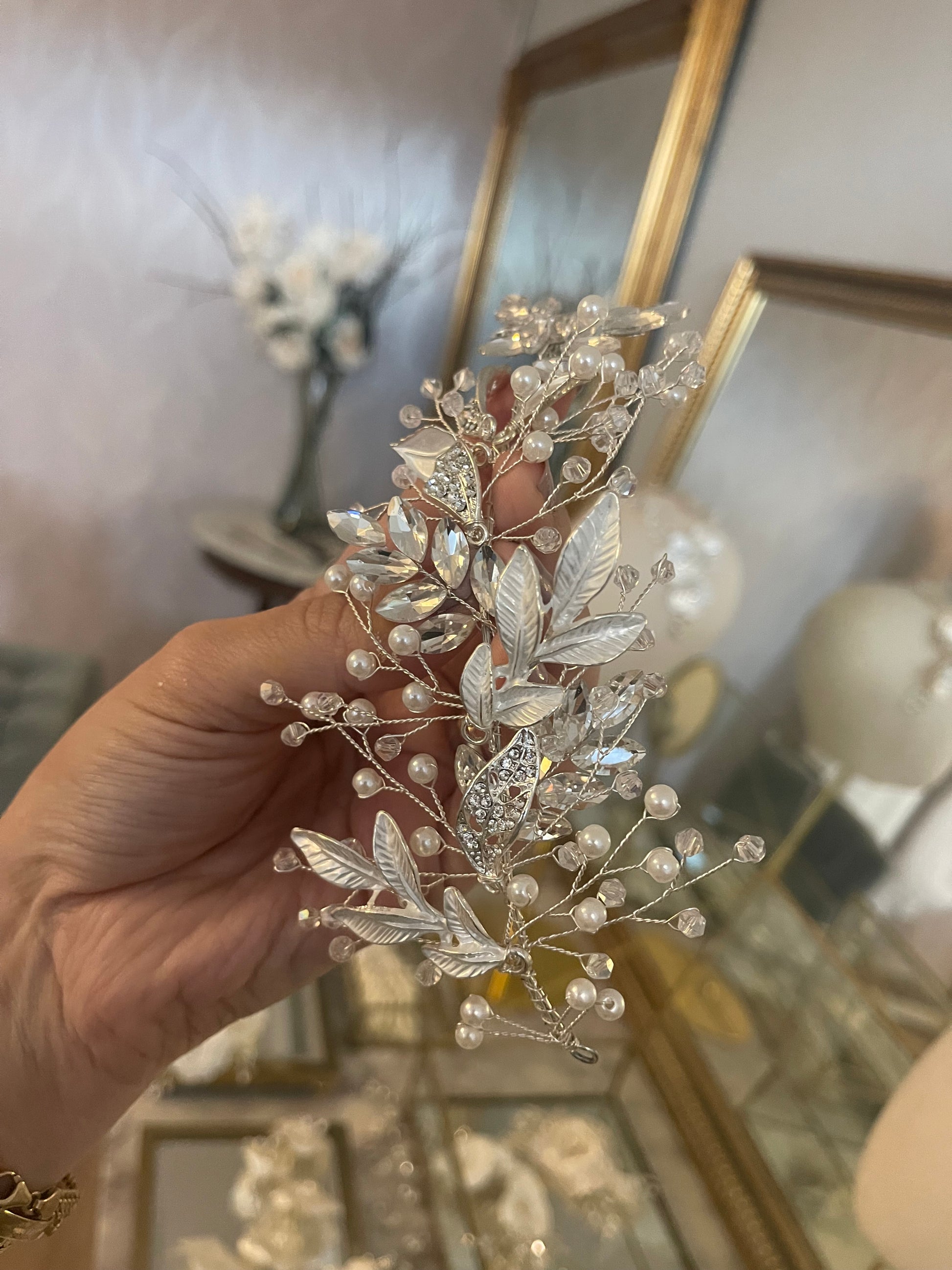 Tocado de ramas de cristales y perlas con detalles de hojas